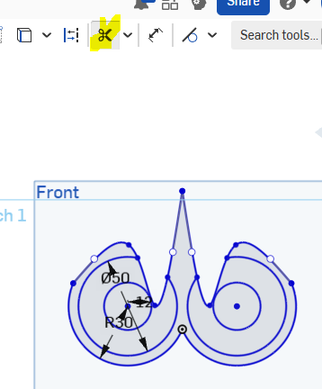 Step 2) Create a 3 point arc. Dimensioned to a radiu of 30, then add a vertical line: