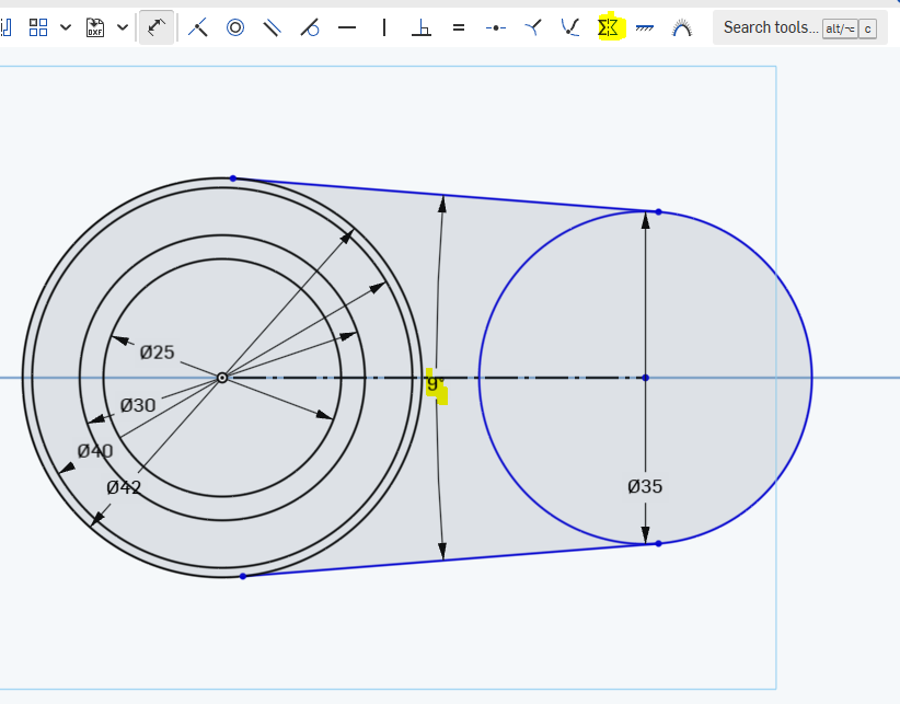 Step 3) connect centers with construction line. Make sure that the blue lines are coincidental to the circles